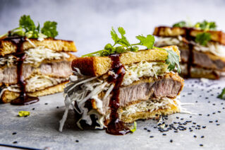 Skal du kose deg med noe skikkelig digg i påsken – da skal du lage deilig, panert svinenakke servert i toast med finstrimlet kål og tonkatsusaus! Nam!